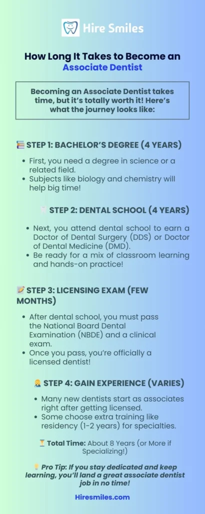 Being an associate dentist is not an easy journey. It asks for a strong commitment, the right learning, and real-world practice. It starts with finishing high school, earning your college degree, and then entering dental school. You need a license too! This path is usually a 7- to 8-year ride. Yes, it sounds quite long, but every step is a building block for an exciting dentistry career. By putting time into your studies and abilities, you’re gearing up to take great care of people’s smiles and oral health. Stay determined, stay sharp. The road to becoming an associate dentist could steer you towards a satisfying and thriving career.